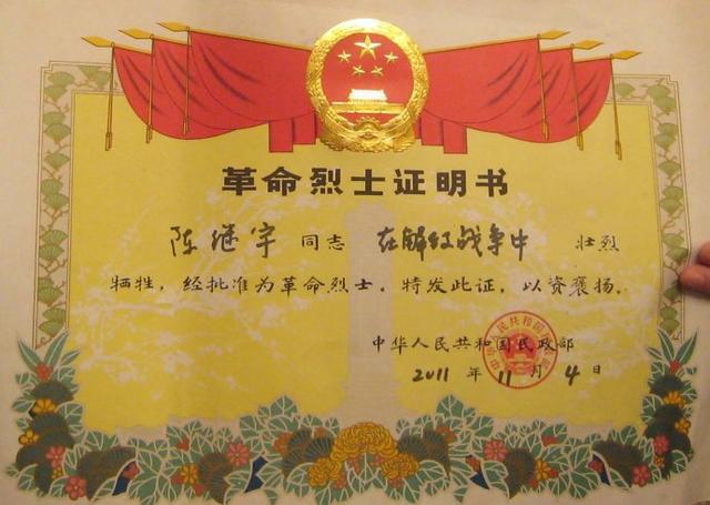 中华人民共和国民政部颁发的“革命烈士证明书”