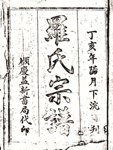 粤稽川省苍、阆、巴、南、昭、广、仪各县族人之来祖,多由有德起,祖籍原来江西吉安府吉水县人氏,移居三楚武昌府蒲邑,复迁黄州麻城县孝感乡。惟我始祖道政,隶籍江西南昌府南昌县北池街,实系罗珠字怀汉之嫡派。历六世有国相、七世有锦,徙居河南南阳府淅川县乌竹岭。锦公生升高公,发迹河南,宦游四川。而豫章罗氏有别为金盆者,盖自豫章分门别户以来,一在南昌,一徙湖广,一游四川。恐后世子孙以历久而忘其所自宗,爰以金盆剖为三半,各执一以为识。故支虽分而可合,族虽别而不离。此由后溯,故数千年来,罗氏之历历可稽者。故兹谱断自骠骑将军始,爰明季升高公授骠骑将军,镇守保宁郡。清朝定鼎之初解祖归田,遂家于仪城西三十里,地名海溪坝裴家寨山下居焉。仪邑之有罗氏,自此始也。升高公愿配夫人杨氏、谷氏、朱氏,杨谷二氏无子,朱氏生子六人:元卿、元相、元勋、元爵、元禄、元祯。后又扩土阆邑羊环山坎下,其地遂以罗家沟名之。卿乏嗣,次房元相住阆地罗家沟,惟相之五子文都,与三四五六房囗住于仪。迄今历十三世矣!而接续其记,以溯其源,实系金盆之裔囗囗囗江西南昌府南昌县,盖仍豫章始云。