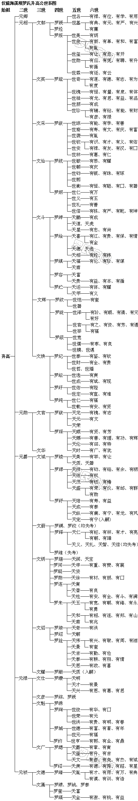 升高公原配夫人杨氏,续谷氏、朱氏,杨谷二氏无子,唯朱氏生六子:元卿、元相、元勋、元爵、元禄、元祯,后扩土阆邑羊环山坎下,其地遂以罗家沟命名。三、四、五、六,与元相之五子文斗俱居于仪邑,迄今已达十四世。其后裔兴旺发达,人口众多,名流荟萃,颇有声望。族人分布于仪陇、南充、阆中等县市。