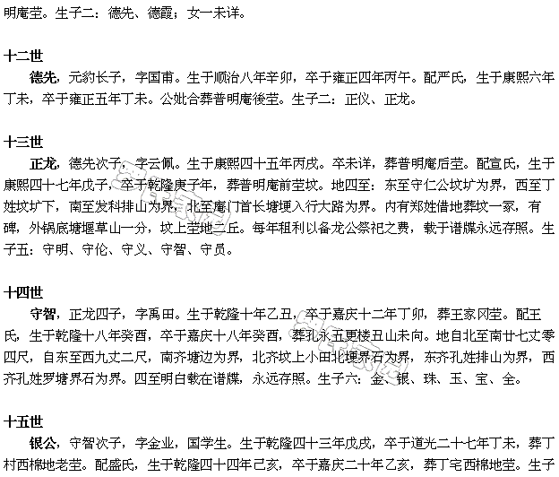 诗雍,银公三子,字秉礼。貤封五品封典,诰封奉直大夫。生于嘉庆二十三年戊寅四月初五日酉时,卒于光绪四年戊寅八月十二日酉时,葬垱堰丁村西首老茔,子山午向。配王氏,王时杰公女,诰封宜人。生于嘉庆二十四年己卯正月初一寅时,卒于同治十三年甲戌九月初三子时,与公合葬。生子二:书铭、书桂。