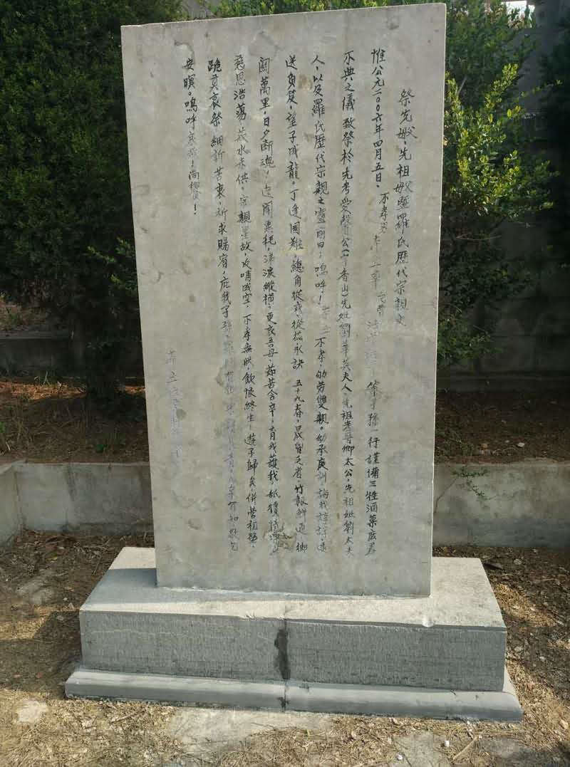 惟公元二〇〇六年四月五日,不孝男率儿曹,法荣、法平等子孙一行,谨备三牲酒菜,庶肴不典之仪,致祭于先考爱馨公(字香山),先妣刘华英夫人,先祖考晋卿太公,先祖妣刘太夫人,以及罗氏历代宗亲之灵前,曰: