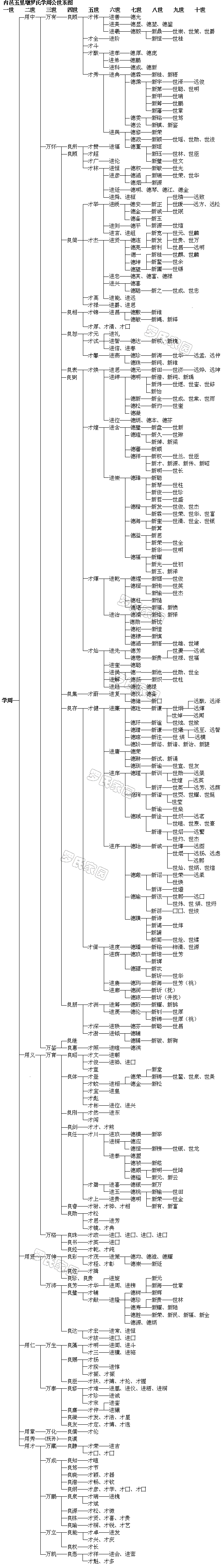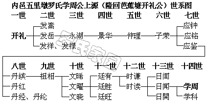作者:罗良富http://www.luos.org 内江五里墩罗氏一族,始迁祖学周公字再作,为湖南邵阳芭蕉塘罗氏开礼公十四世孙,日闻公长子。开礼公原籍江西,宋季宦湘,任武冈军教授。适潭州及湖南州军被陷于元,开礼公殉节,葬于湖南邵阳芭蕉塘,子孙遂落籍于斯,开礼公乃为湖南开派之祖。传十三世至日闻公,均为湘籍。日闻公生子学周、学科。学周公于清初由湘迁蜀至内江拓土丛林,为内邑罗氏初祖。学周公妣李氏,生子七:用中、用义、用贤、用仁、用章、用秀、用才。其中,五房无嗣,抚子代绝,六房无嗣,抚孙迁入犍为。余皆人丁兴旺,代有闻人,蔚为名族。民国间有罗懋昭纂修的内江豫章祠罗氏族谱八卷。