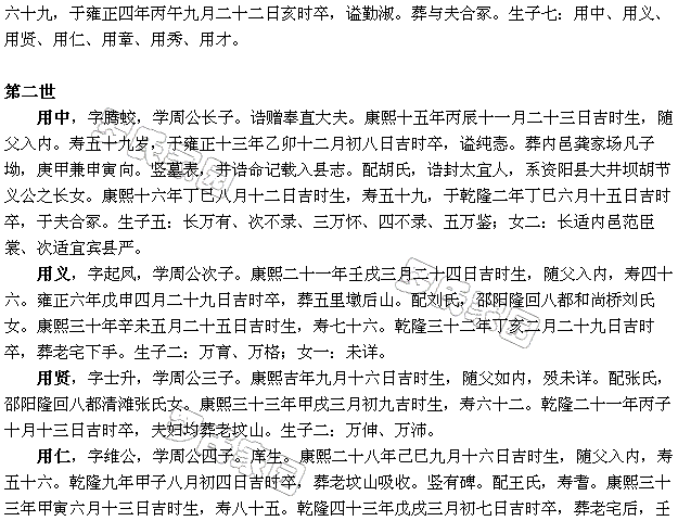 山丙向,竖有碑记。生子二:万生、万泰;女六:两适张、两适谢、一适萧、一适庠生李如兰。 用章,字灿然,学周公五子。康熙三十一年壬申二月十六吉时生,随父入内,寿三十六。雍正无年丁未六月十七吉时卒,葬祖山左,辛山乙。配宋氏,康熙三十五年丙子十一月二十一吉时生,寿四十五。乾隆五年庚申正月十六吉时卒,葬与夫合冢。生子一:万化;女一:适粟。 用秀,字呈花,学周公六子。康熙三十三年甲戌六月初六日吉时生,寿七十三。乾隆三十一年丙戌六月二十六吉时卒,谥耿介。葬回龙湾。配李氏,康熙十六年丁巳十二月十一日吉时生,寿七十二。乾隆十三年戊辰四月三十吉时卒,葬倒冲子。抚同宗尚大人之子良谟为孙。迁居犍为县。 用才,字犹为,学周公七子。康熙三十八年己卯七月初四吉时生,乾隆五十年乙巳七月初五吉时卒,葬回龙湾,有碑。配申氏,贵州石阡府人氏。康熙三十八年己卯十二月十四吉时生,雍正六年戊申五月初三吉时卒,葬祖山侧。生子一:万藏;女一:适大石鼓陈。继配刘氏,康熙五十年辛卯九月十二吉时生,乾隆三十年乙酉二月初一吉时卒,葬与夫合冢。生子五:万成、万联(缺)、万立、万鹏、万凯。
