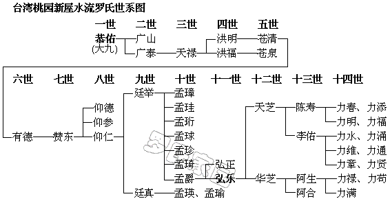 作者:罗良富http://www.luos.org 桃园新屋水流罗氏一族,乃昌龄─尚古─谷贤─洪德公派下恭佑(大九)之裔,原居于粤东惠州府陆丰县之石碓头(大安镇南溪管区上寮村)。谱载其上源为: 珠→居厚→立→臣恭→谌→徽→彦→立成→佑郎→公望→志海→幼行→澄郎→德郎→遵生→友→玉孙→诚忠→子元→仕通→祖美→元有→昌逊→祥珦→景宣→其秀→仪真→景新→仕伦→元杰→子建→仲大→谋→俊→仲权→安庆→学政→顺德→自高→廷标→惟受→思行→奉初→昌龄→尚古→宁郎→志兴→秀周→谷贤→彦邦→洪德→恭佑(大九)。 至清朝中叶,嘉庆年间,恭佑第十一世弘正、弘乐公,携其二子天芝公、华芝公,渡海迁台,从事垦殖,定居于今之桃园县新屋乡赤栏村廿九号现址(俗称“老屋”)遂为在台之发祥地。此外,在今之石磊村水流四号称为“上罗屋”,在今之赤栏村卅五号称为“下罗屋”,当时拥有三条龙岗之地。世代相传,至今廷绵愈广,发荣未已。一九八九年,曾组团回陆丰原乡谒祖。