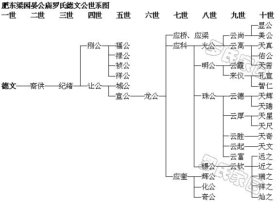 作者:罗良富http://www.luos.org 安徽肥东梁园晏公庙罗氏一族,望出豫章。始祖德文公字懋昭号宗柏,祖籍江右。元顺帝至正十年,公自江西南昌郡内百林罗始迁淝东择居观德桥畔而家焉,后裔建祠于庐郡登云街。七传至应科公,复移居梁园西南乡晏公庙侧,经世蕃衍成族。溯其源,乃为德文─龙公派下之一支也。