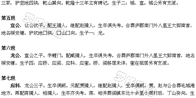 第八世 光公,应科长子,字春宇。元配高孺人,继配黄孺人,生卒俱失考。合葬中罗岗村南首,艮山坤向。生子二:云尚、云高。 明公,应科次子,字佑宇。配江孺人,生卒俱失考。袝葬毛城港应科公墓下。生子二:云霞、来仪。 珠公,应科三子,字宏宇。配胡孺人,生卒俱失考。合葬罗大郢东首,癸山丁向。生子五:云德、云厚、云胜、云起、云富。 锡公,应科四子,字成宇。配杨孺人,生卒俱失考。合葬柳桥湾西偏,丙山壬向。生子一:云钦。
