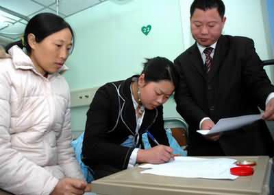 回到家里的罗玮,受到亲友的一致劝阻,可她态度坚决,表现激烈,父母怕她出事,又来成都医院。廖红霞怕引起人家父母担心、家庭不和,拒绝接受捐肝,罗玮父母这才放心,同意她留下照看廖红霞,回去打工。3月25日廖红霞婆婆带她女儿来看她,看到母女亲情的罗玮,她又采取了第三个行动:偷拿了户口,按医院要求去做了公证,捐肝无偿无悔,手术问题责任自负,而且还约束父母不得向罗家问责索酬。华西医院决定3月30日进行手术,术前又一次检查讨论,发现罗玮肝部血管变异,需要搭桥,增加了手术风险,告诉罗玮她随时都可以退出。罗玮说要退我早就退出了,这是救人命的事,怎么能开玩笑呢。(上图:罗玮<中>在世界上独一无二的协议上签字 )