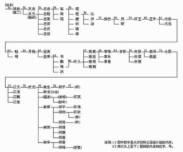 二 入川发派世系 一(珠系51)世 祥胜公,字胜二,安道公次子,江西吉水县生长人氏,明代处士;元“致和”(1328)年间迁湖广麻城县落业,配李氏(麻城县仙居乡生长人氏),生友忠(相传后随母李氏婆复回麻城落业)、友文二子;明“洪武”二(1369)年己酉岁徙居川东永川松溉镇;卒葬于松溉两路口金龟洞(有碑铭尚存)。李氏婆卒葬于麻城县仙居乡。 二(珠系52)世 友文公,字翰成,祥胜公之次子,生于麻城县陡阜之阳;配吴氏(麻城县生长人氏),生志忠、志聪、志高、志贤、志贞、志谅六子[有清“嘉庆”二(1797)年谱载];卒于明“洪武”卅(1397)年丁丑岁,葬于永川朱沱四望山。吴氏婆卒葬于江津石蟆区杨柳乡唐河六贡坝。 三(珠系53)世 志忠公,字公时,友文公之长子;配苏氏,生瑜、琦、瑢三子;卒葬于松溉后溪河。 同代叔祖 二房志聪公,卒葬于松溉黄石龙; 三房志高公,卒葬于松溉朱沱对面大东溪; 四房志贤公,卒葬于松溉朱沱上面五脉水; 五房志贞公,卒葬于松溉牛勃石; 六房志谅公,卒葬于松溉青子山大龙塆。 四(珠系54)世 瑜公,字尚韬,志忠公之长子;配江氏,娶刘氏,生锟、铿、鑚、钊、镇、锝六子。 五(珠系55)世 铿公,字仲和,瑜公之次子;配胡氏,生沁、浒、治三子;卒葬于松溉下旗山。 六(珠系56)世 浒公,鉴公之次子;配周氏,生焕然一子。 七(珠系57)世 焕然公,浒公之独子;配邹氏,生凤、砰二子。 八(珠系58)世 凤公,焕然公之长子;配Δ氏,生怀玉一子。 九(珠系59)世 怀玉公,凤公之独子;配Δ氏,生正中一子。 十(珠系60)世 正中公,怀玉公之独子;配Δ氏,生太勋、太龙二子。 十一(珠系61)世 太勋公,正中公之长子;明末徙居江津打鼓山黄泥垉,后再徙仁怀赤水里下庄坝;配高氏,生魁、明二子;二老卒后合葬于黄泥沟魁子山,有碑为记。 十二(珠系62)世 魁公,太勋公之长子;配周氏,生月镜一子;卒葬于赤水里下庄坝,墓前有即盆石为记。 十三(珠系63)世 月镜公,魁公之独子,从仁怀迁回江津县秦家乡李家坝罗沟落业;配祝氏,生登高(字贞云,派千佛桥支)、登荣(派罗沟支)二子;卒葬于江津十二单杨景坝狮子山。祝氏婆卒葬于江津县秦家乡李家坝罗沟宅后。 十四(珠系64)世 登荣公,月镜公之次子;落业江津县秦家乡李家坝罗沟;配祝氏,娶李氏,生书、麟、锦、洪四子;寿高80余岁。 十五(珠系65)世 锦公,登荣公之第三子;配胡氏,生好义一子;卒葬于罗沟坟塆。胡氏婆卒葬于罗沟对面柏林塆。 十六(珠系66)世 好义公,锦公之独子;配曹氏,生豫襄、豫廷、豫明、豫朝四子;曾修谱存世;卒葬于江津县南峰里六贡坝。 十七(珠系67)世 豫襄公,好义公之长子;配曹氏、娶曾氏,生章锦、章肖、章善三子;卒葬于柏林塆。曹氏婆卒葬于松林塆;曾氏婆卒葬于板桥打鱼塆。 十八(珠系68)世 章锦公,豫襄公之长子;配张氏,娶苏氏,生吉祥一子;卒葬于六贡坝。张氏婆卒葬于沟子下;苏氏婆卒葬于朱家嘴。 十九(珠系69)世 吉祥公,章锦公之独子;配凌氏,生安敦、安儒、安德三子;二老卒葬于下塆。 二十(珠系70)世 安敦公,吉祥公之长子;配杜氏,生泰泽、泰鉴二子;卒葬于柏林塆。杜氏婆卒葬于殷家堡。 廿一(珠系71)世 泰泽公,安敦公之长子;配刘氏,娶樊氏,生永图一子;三老卒葬于殷家堡。 廿二(珠系72)世 永图公,泰泽公之独子;配陈氏,生江文、江淮、江麟、江桂四子;卒葬于道场坝。 廿三(珠系73)世 江文公,永图公之长子;配张氏,生庆元一子。 廿四(珠系74)世 庆元公,江文公之独子,生于清“光绪”廿五(1899)年己亥岁腊月廿六日;配游道福,生南福、福全、南全三女及南生、南吉、福清、南厚、南简、南华六子。游道福,清“光绪”廿七(1901)年辛丑岁七月初九日巳时生于江津县朱杨乡旗山沟屋基。 廿五(珠系75)世 南生,庆元公之长子;配李树财,生阳林、阳贵、阳芳三女及阳平一子。 廿六(珠系76)世 阳平,南生之独子;配陈昌红,生成一子。 廿七(珠系77)世 成,阳平之独子。 廿五(珠系75)世 南吉,庆元公之次子;12岁时病故。 廿五(珠系75)世 福清,庆元公之三子;配李泽贞,生清明、新年二子及阳芝、四妹、五妹、六妹四女。 廿六(珠系76)世 清明,福兴之长子;配唐学贞,生怀英一子。 廿七(珠系77)世 怀英,清明之独子。 廿六(珠系76)世 新年,福兴之次子。 廿五(珠系75)世 南厚,庆元公之四子;配熊继书,生阳平、阳树、阳财三子及三妹一女。 廿六(珠系76)世 阳平,南厚之长子;配何朝芳,生怀伟一子。 廿七(珠系77)世 怀伟,阳平之独子。 廿六(珠系76)世 阳树,南厚之次子;配温绪群,生怀秋、春二子。 廿七(珠系77)世 怀秋,阳树之长子。 廿七(珠系77)世 春,阳树之次子。 廿六(珠系76)世 阳财,南厚之第三子;村长;配周 ,生林一子。 廿七(珠系77)世 林,阳财之独子。 廿五(珠系75)世 南简,庆元公之第五子;配樊时贵,生阳清、阳康、阳超三子及阳芝一女。 廿六(珠系76)世 阳清,南简之长子;配杜在群,生小琴一女。 廿六(珠系76)世 阳康,南简之次子;配钟力,生娅一女。 廿六(珠系76)世 阳超,南简之第三子;配李芳群。 廿五(珠系75)世 南华,庆元公之第六子,生于1943年六月五日;配程从书,生阳春、阳峰二子。程从书,生于1950年二月廿九日。家住西彭镇油库十五幢2号。 廿六(珠系76)世 阳春,南华之长子,生于1971年1月23日;配邹贤萍,生雨佳一女。邹贤萍,生于1972年2月12日。 廿七(珠系77)世 雨佳,阳春之独女,生于1996年12月13日。 廿六(珠系76)世 阳峰,南华之长子,生于1974年1月17日;配冉海萍,生