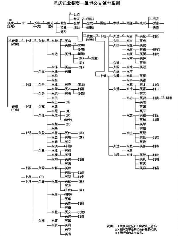 招贤公,夫人鲜氏(系明川西总兵鲜永桥之女,渠县鲜渡河人)也生三子。长子维世,夫人林氏,后迁川东,落业重庆江北区(现渝北区)四甲柿子坪;次子、三子,不知流落何地。