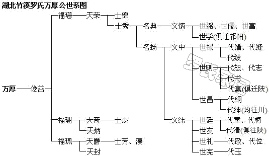 现该族成德析居六里坪罗家湾及本镇各地约400余人;成章析居六里坪镇财神庙村花树下官山松树沟大柳树约400余人;成忠房析居十堰市茅塔乡茅塔村现约有300人,成顺房住竹山县温水罗家及汉中等地。