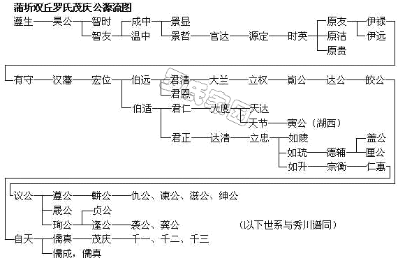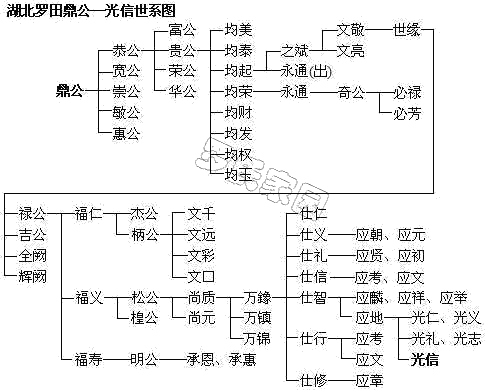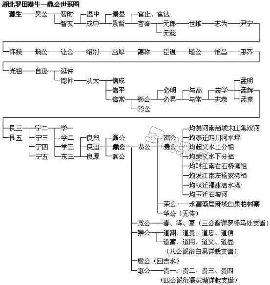 遵生→昊→智时、智友→温中、成中→景显、景哲→官止子二癸辰居湘阴、官达、官奉→元郎、元稔后徙瑞州,元郎→世推→志为→尹宁→怀操→珦→让→绍刚→益厚→德称→臣通→瑾→惟昌→思齐→光祖→自逊→延仲、德仲→从大→信成、信平、信常→彰、彩,彰→必明、必昇→与高、与常→志学、志恭,志学→孟明、孟辉、孟章,孟辉→艮三、艮五,艮三→宁二、宁三、宁四、宁五,宁二→学一、学二、学三、东三→良积、良迪、良厚,良迪→鼐、鼎、鼒,鼎明初迁湖北麻城白果为西陵罗氏始祖→恭、宽、崇、敏、惠。