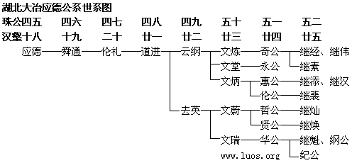 应德公是三荣公三子,汉壑公18世孙,即珠公四十五世孙。居阳新四角山。妣刘氏生子舜通,妣吴氏生子伦礼,又妣徐氏,其子孙迁居大冶,实际是伦礼公落业于大冶杉树宕,因崇应德公,故奉为始祖,已成习惯,后人遵循。约清代中叶,全村复迁罗汉山即今之八斗庄。越数年,伯上公庄西约五里之罗水井庄开基。至十二世孙忠灵迁四川顺安府南衡县罗家场,淑字辈有夏、团、山三公迁居四川;仲茂迁居英山县。清同治间世钊、清光绪间世钲俱江南贸易未归。约四百多年,已繁衍二十二代,约210人。克勤一家三个大学生,其中两个博士在美国留学。克兴是扬子建筑集团经理,拥有资产1000万以上,兄弟四人为本庄祖堂重修献资3万多元。2003年为本地修大成谱献资1万元。2004年为《中华罗氏通谱》献款2000元。