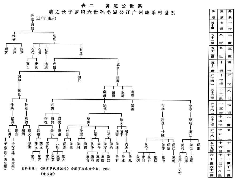 《康乐谱》记至务滋十二世,罗贵十八世。