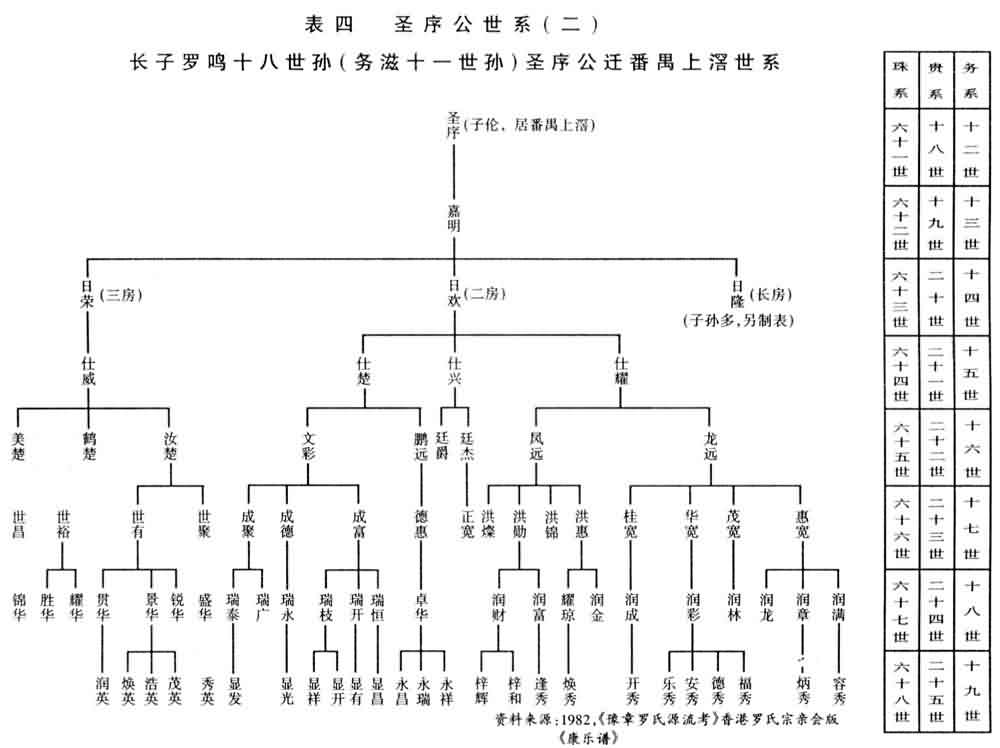 圣序一子名义明,义明后有三子:日隆、日欢、日荣。人丁开始增长,使圣序上滘一支,成人丁众多,与康乐务滋系、车陂(包横沙)系成为番禺罗氏三大派系。