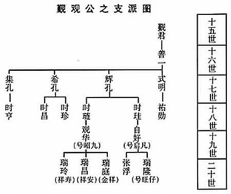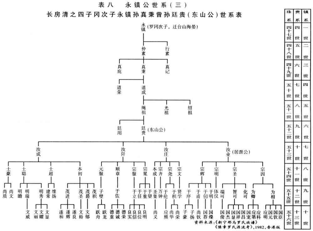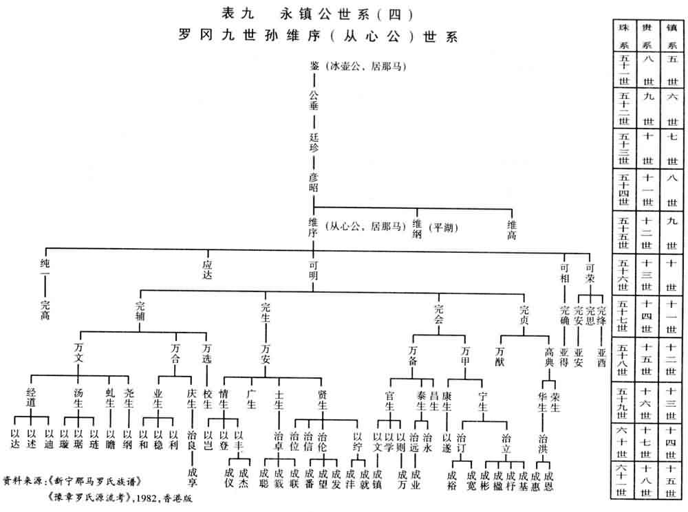计由永镇为一世,历仲素——真记(长房)——道缘——泉斋——仕芳——伯思——道英——维恭——朝范——士辉迁海南岛,为十一世,罗贵为一世计起为十四世。