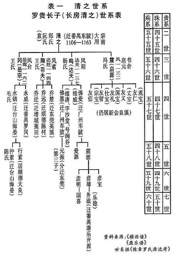 1.清之三世孙维新自车陂迁横沙(1276) 据《槎滘谱》载:“清之……子孙散居番禺县车陂、鹿步、永泰里居住。车陂乃公始建也。至三世维新(按清之次子罗鸣次子名维清,兄维盛,未见维新,可能为二子维清之误),避宋末元初之乱。次子迁横沙,故奉公(即清之)为始祖。”