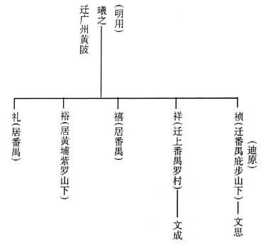 “于是由江古入岭南,原居南雄府始兴县著(‘著’原字左边加‘石’)矶里(即珠玑巷)。以南宋开禧年间,因事诏民迁徙时,随吾祖而迁者,计九十八家,悉有名人等。而大宗始祖之六郎公,遂择番禺之北,居大田乡,则谱所谓称大田始祖六郎从迁也。未几,芳圃公复支迁花邑(即花县)莘田(在流溪河北岸),生五子:长曰仁叟,留莘田;次义叟,迁芳村;次礼叟、智叟迁市桥者,或为智叟或为信叟,而木棉房之礼叟,谱录固殊焉。”