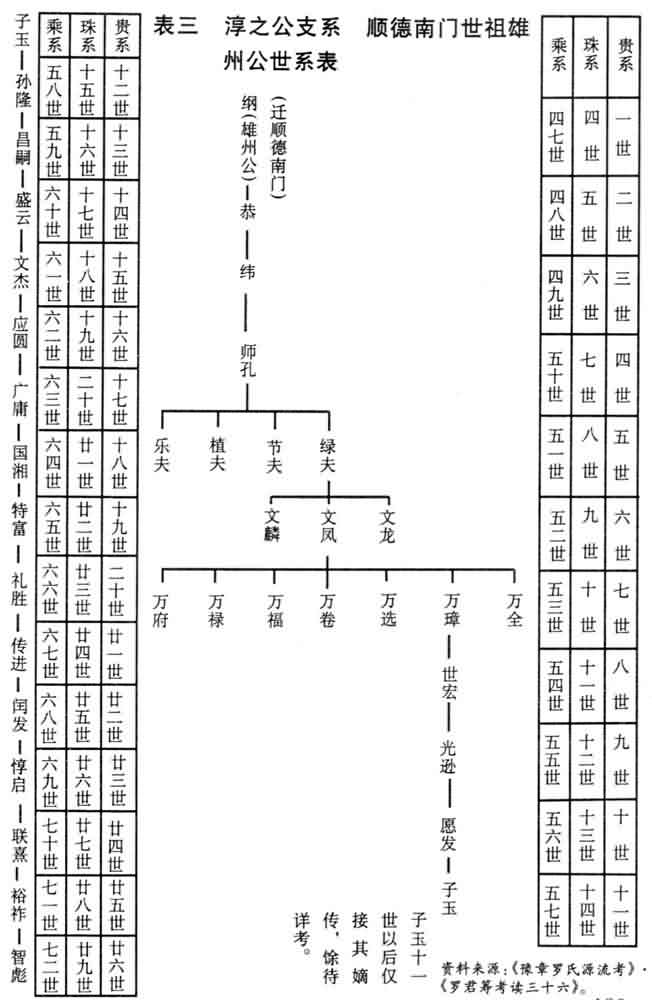 “辉之(顺德北门,贵系二世)——宝珍(长子)——彦荣(过继四弟宝裔)——颜公(长子)——原仲(长子)——景任(独子)——德凤——应隆(字敬甫)——永年(字陋巷)——兰庭——月川——西涧——高——仍——于道——服泉——为昌——世宪——仰松——观悲——滋大——开诚——焜海(三子)——庆桐 (号满华)——冠南 (长子)——国流 (次子)——士洪(次子,贵系廿八世,珠系七十一世。)
